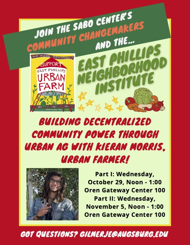Building Decentralized Community Power through Urban Ag with Kieran Morris, Urban Farmer! Join East Phillips Neighborhood Institute Urban Farmer, Kieran Morris, and the Sabo Center's Community Changemakers to learn about the way that growing food in our cities builds health, power and agency in our neighborhoods. This will be the first of two talks by Kieran, and a series of talks and workshops from EPNI staff over … Continue reading "Building Decentralized Community Power through Urban Ag with Kieran Morris, Urban Farmer!"