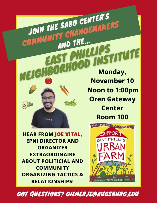 Join the Sabo Center's Community Changemakers and the East Phillips Neighborhood Institute's Finance & Develeopment Director, Daniel Colten Schmidt, for a talk about doing finance and fundraising work for the Roof Depot site and EPNI. Daniel writes grants and speaks with philanthropists and investors; while also striving to protect the neighborhood from predatory financial interests. … Continue reading "Community Changemakers: Daniel Colten Schmidt of EPNI talks Finance & Fundraising for Community Movements"