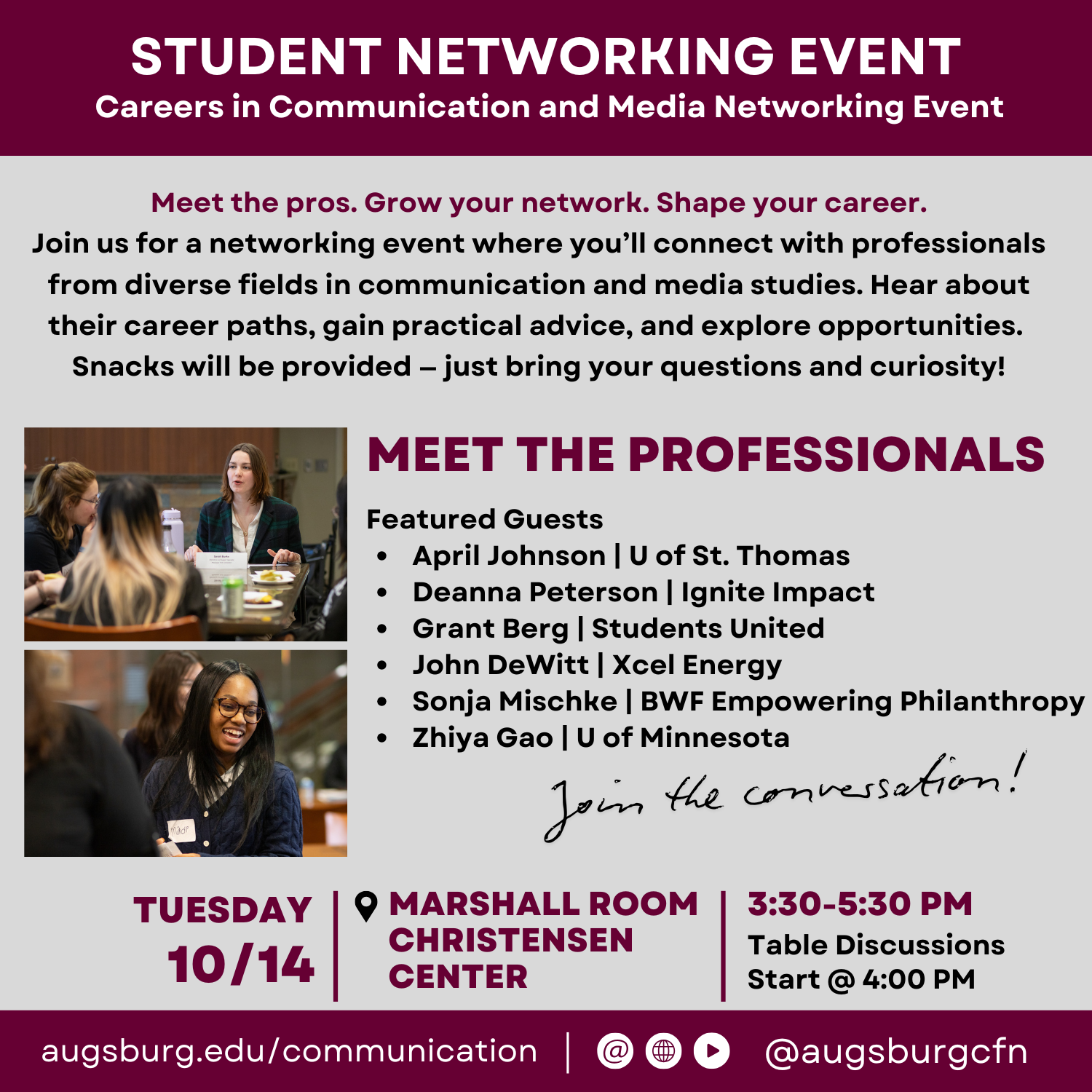 Each of Augsburg’s five schools will host an informal gathering where you can connect with faculty, staff, and students, explore programs, and learn more about career pathways - complete with … Continue reading "“Meet Your School” events"