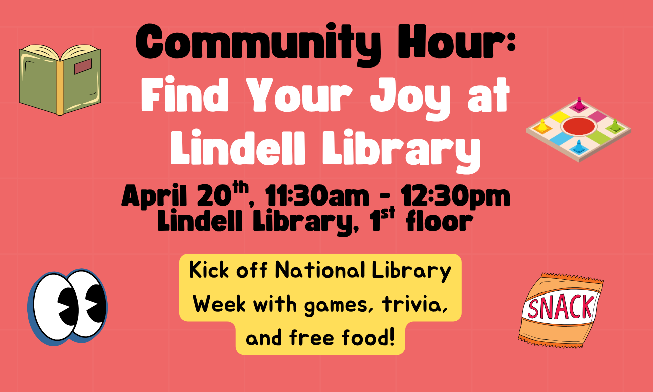 Help us kick of National Library Week with an hour of fun and joy! We will have games, trivia, and free food (for as long as it lasts.) Stop by the first floor of Lindell Library for ten minutes or the whole hour. Everyone is invited!